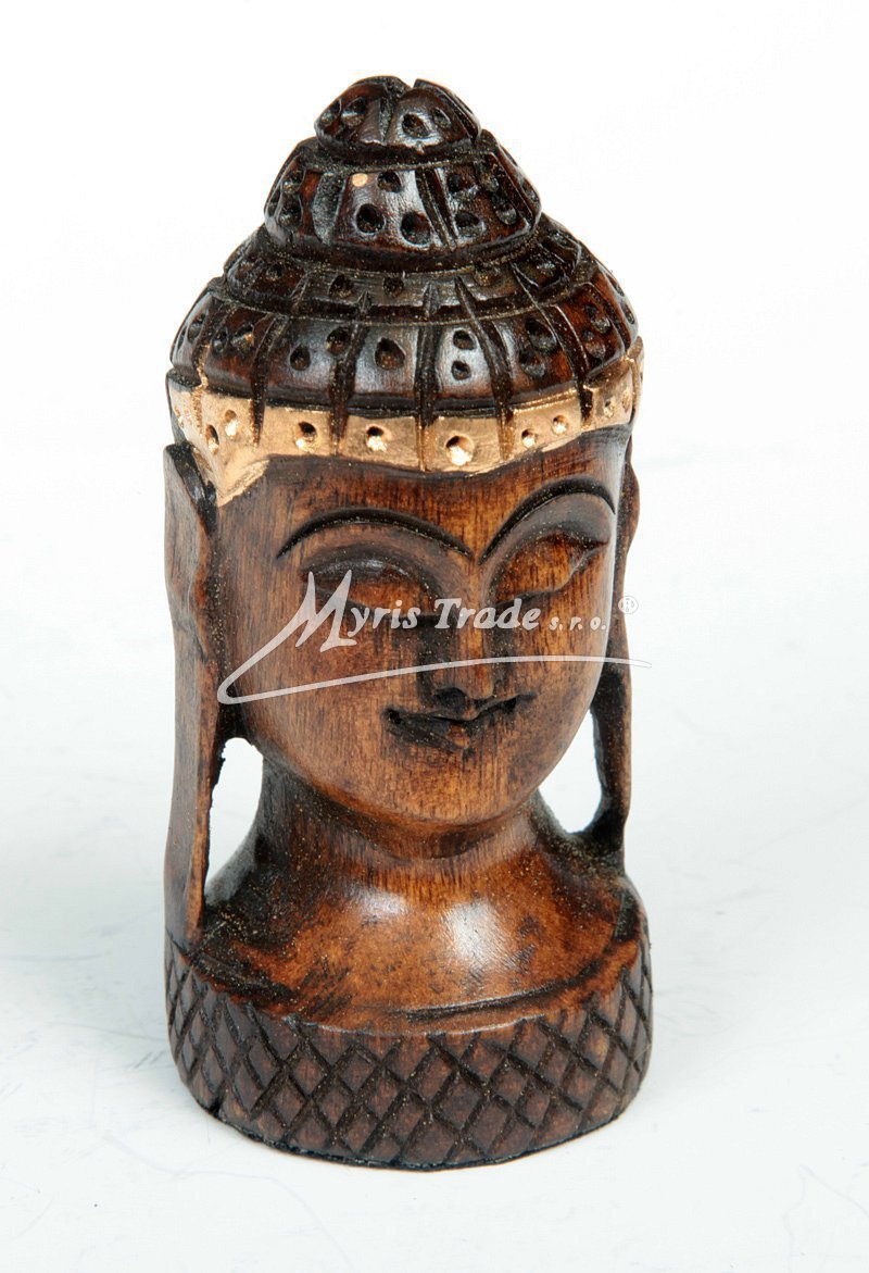malá, ručně vyřezávaná figurka hlavy Budhy z tmavého dřeva, zdobená zlatou barvou