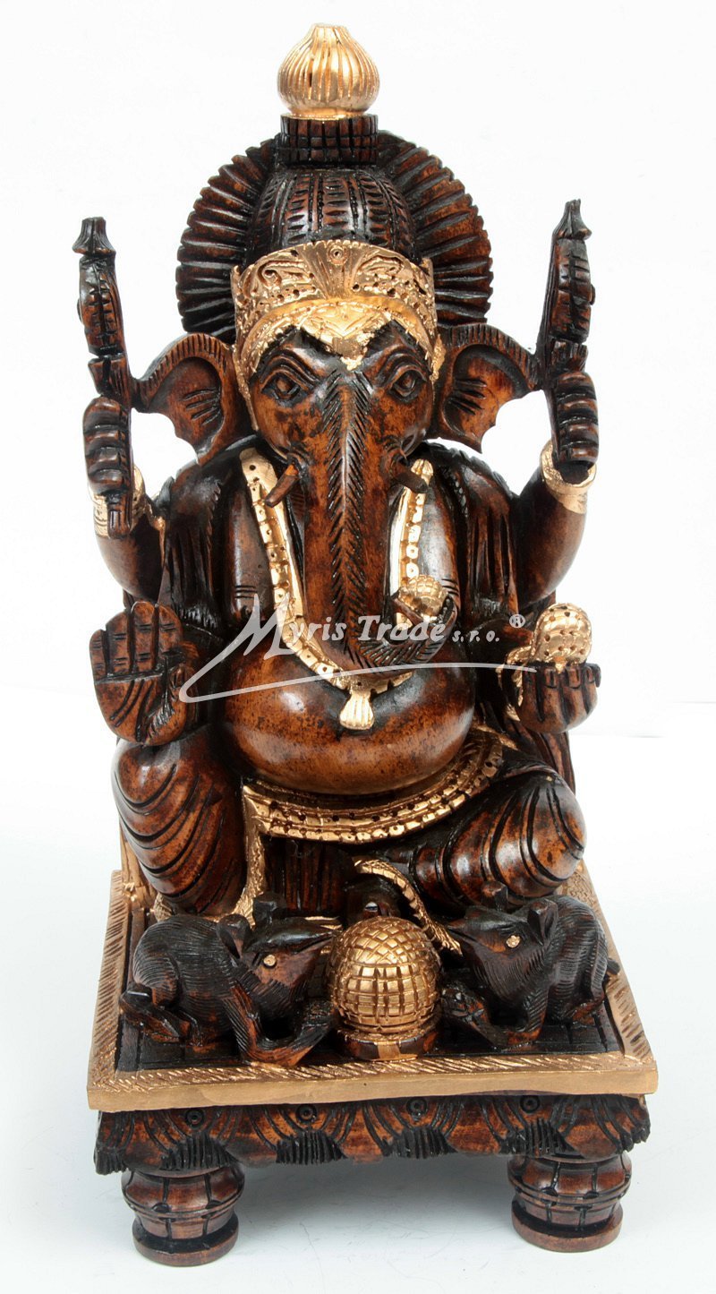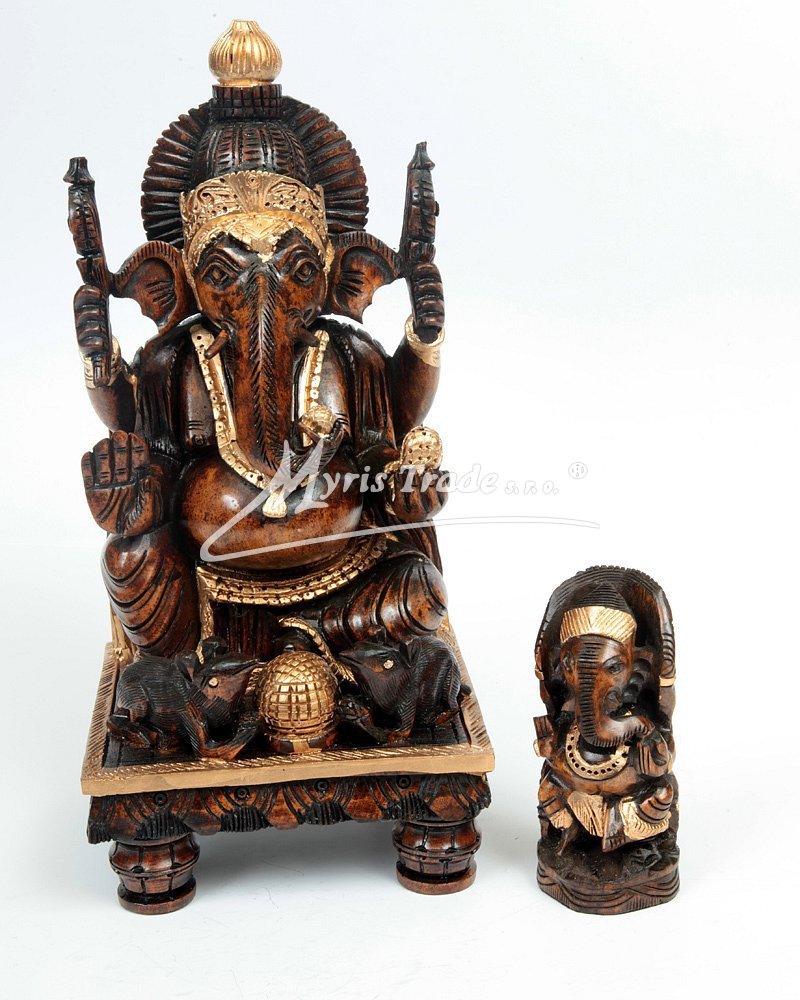 velká, luxusní, ručně vyřezávaná soška Ganéši, hinduistického boha - odstranitele překážek, z tmavého dřeva, zdobená zlatou barvou