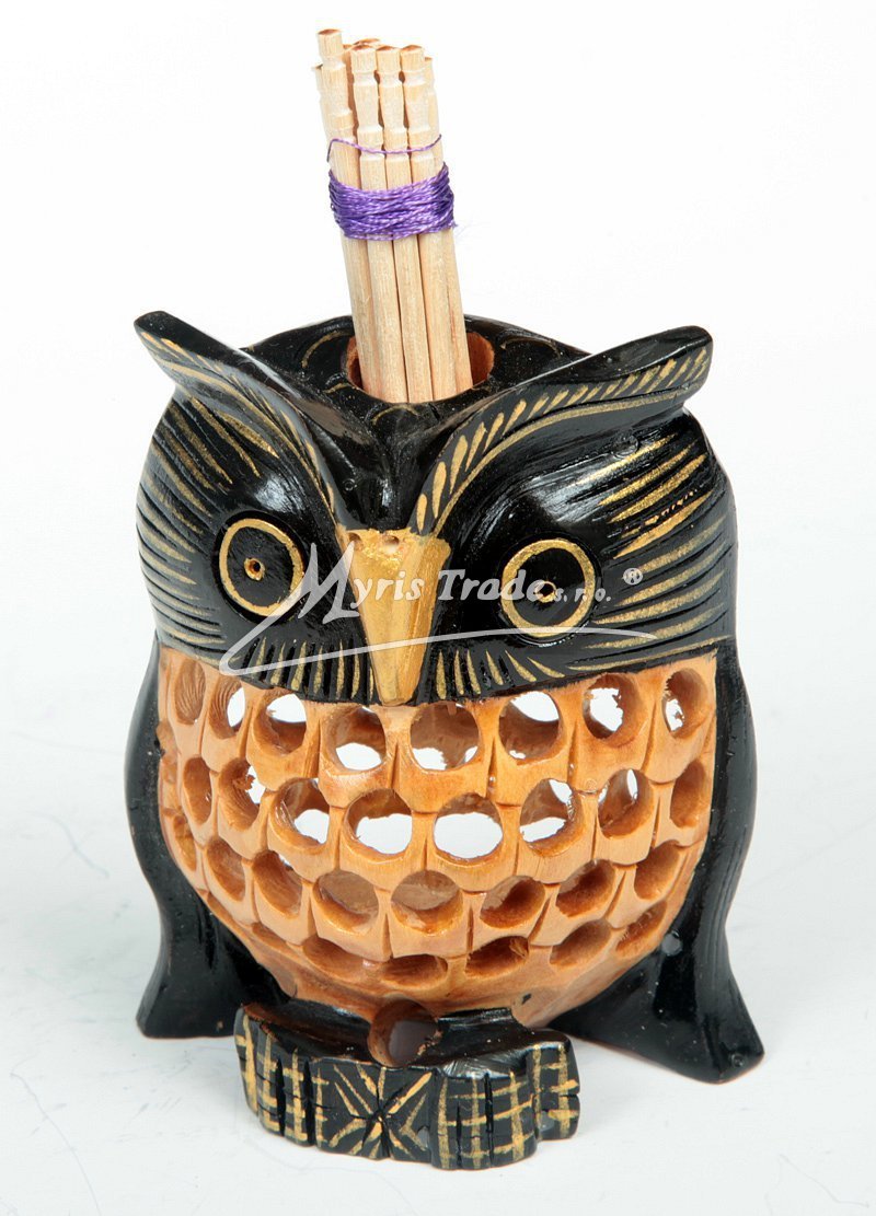 sova - dřevěný, ručně vyřezávaný stojánek na párátka, světlé dřevo v kombinaci s černou barvou