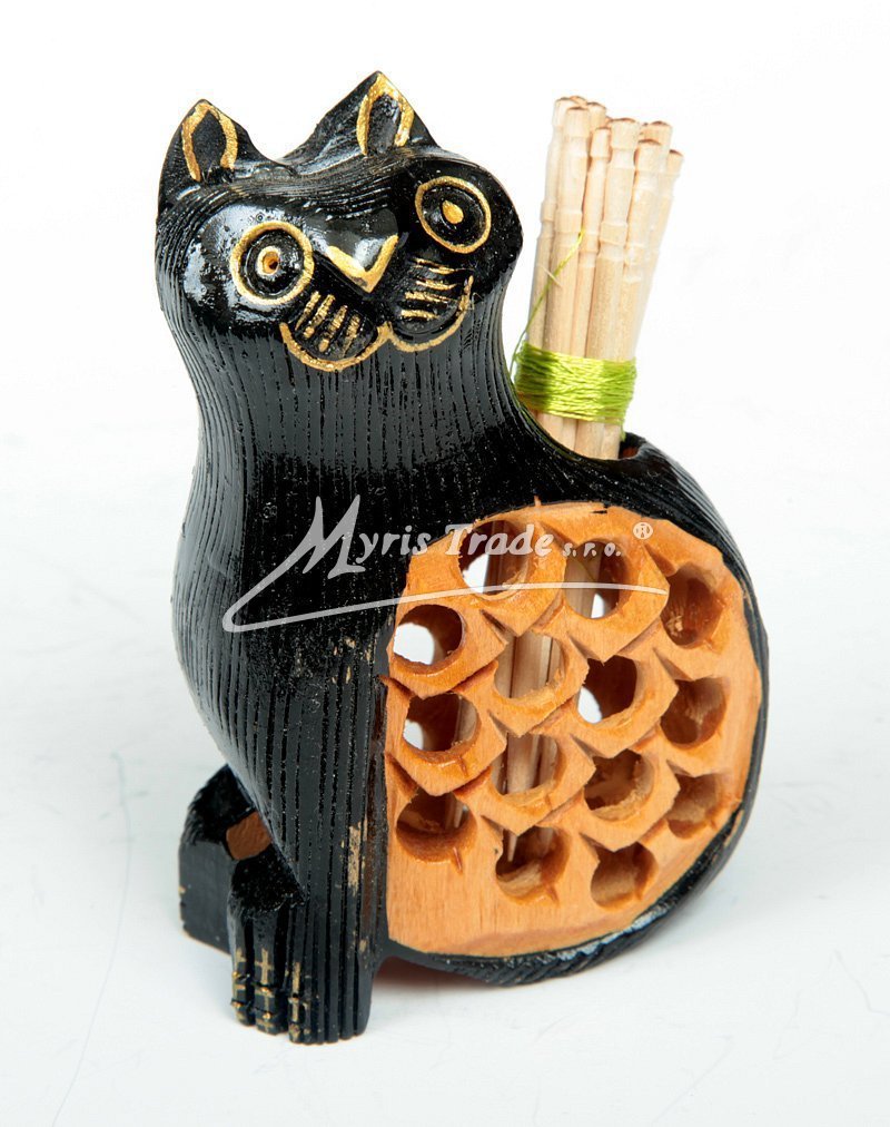 kočka - dřevěný, ručně vyřezávaný stojánek na párátka, světlé dřevo v kombinaci s černou barvou