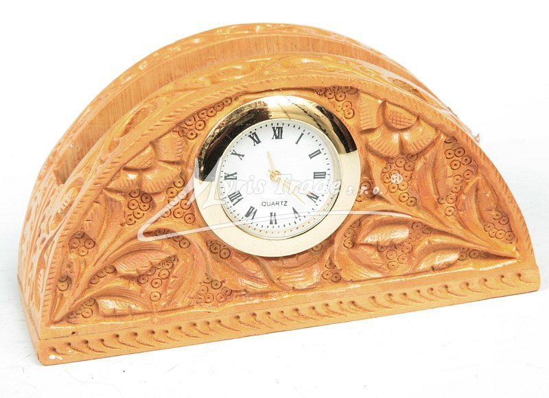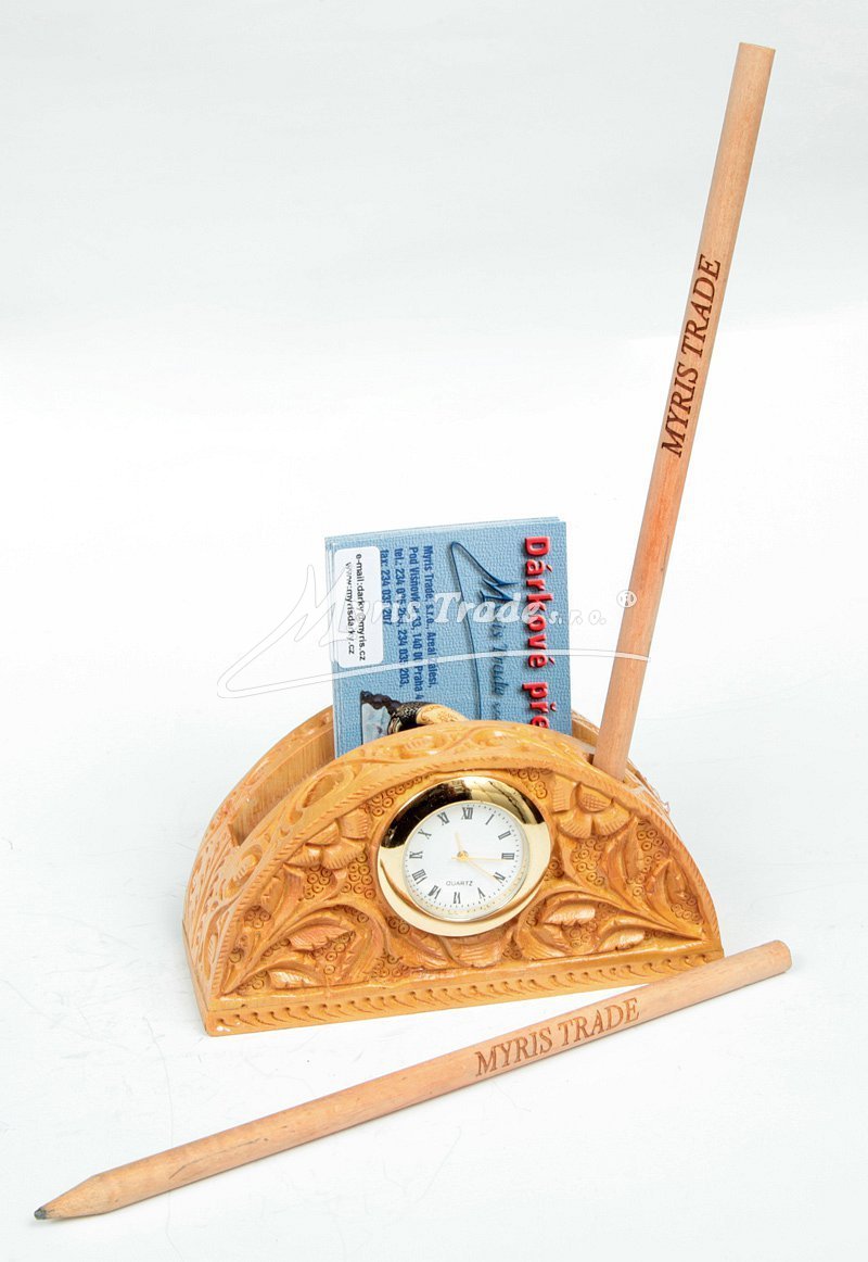 dřevěné stolní hodiny ze světlého dřeva, s vyřezávaným motivem květin, zároveň slouží jako stojánek na vizitky