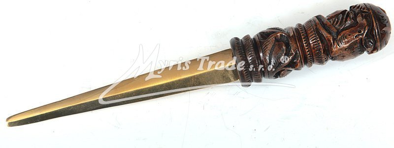 mosazný otvírač na dopisy v ručně vyřezánavou dřevěnou rukojetí