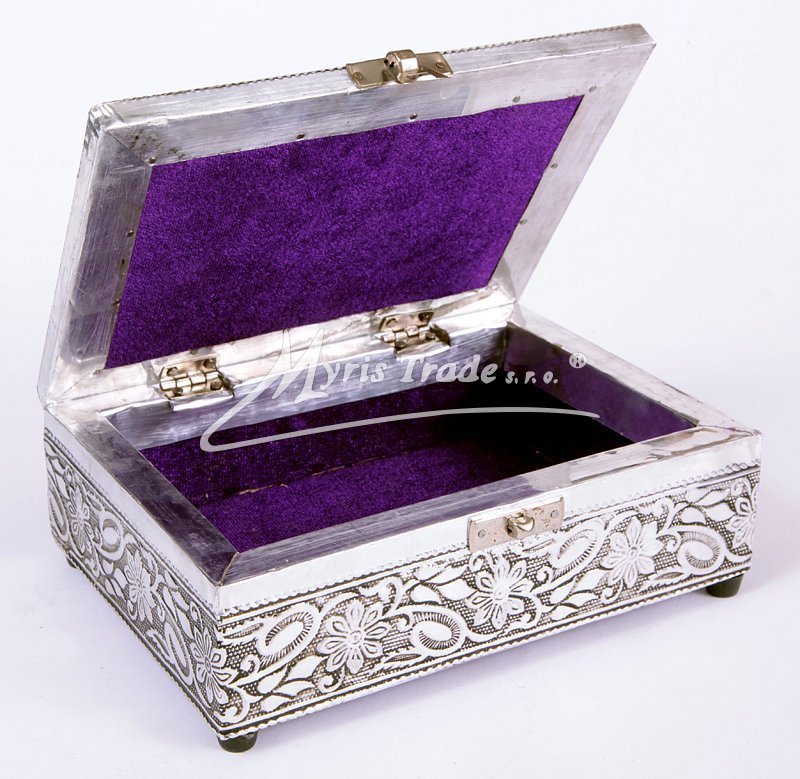 velká šperkovnice z tepaného stříbrného kovu na víku zdobená motivem slonů, s vnitřkem vykládaným fialovým sametem