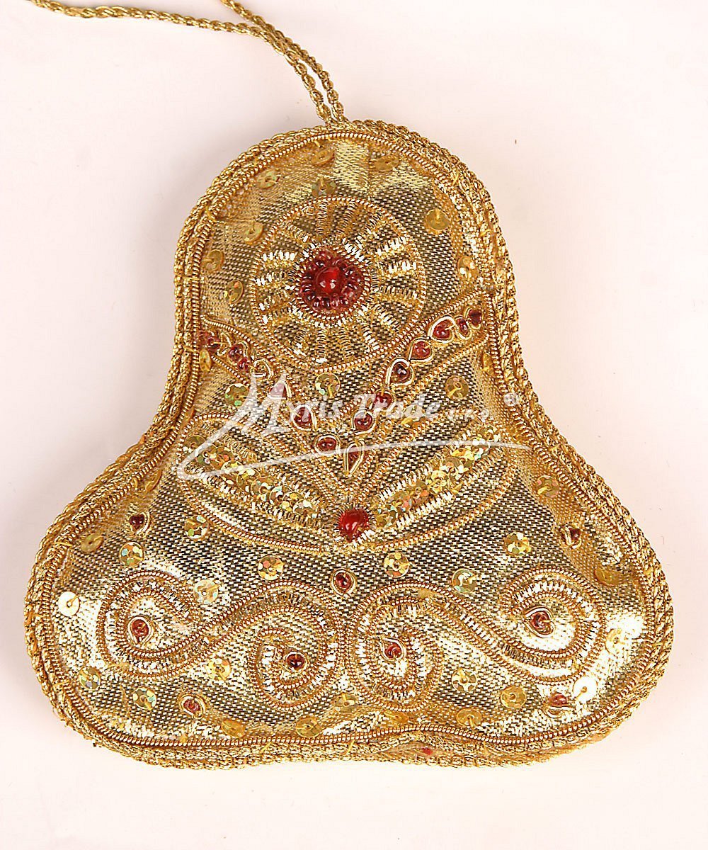Ručně pošívaná textilní vánoční ozdoba. Tato typická vánoční ozdoba je vyrobena z textilu a je bohatě ručně pošitá drobnými korálky, flitry a kovovým drátkem ve zlaté barvě.