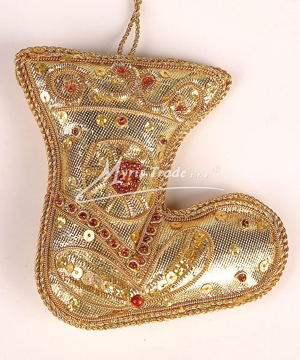 Ručně pošívaná textilní vánoční ozdoba. Tato typická vánoční ozdoba je vyrobena z textilu a je bohatě ručně pošitá drobnými korálky, flitry a kovovým drátkem ve zlaté barvě.