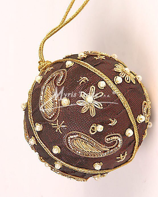 Textilní vánoční koule s perličkami. Vánoční koule je ručně pošívaná perličkami a kovovým drátkem ve zlaté barvě.