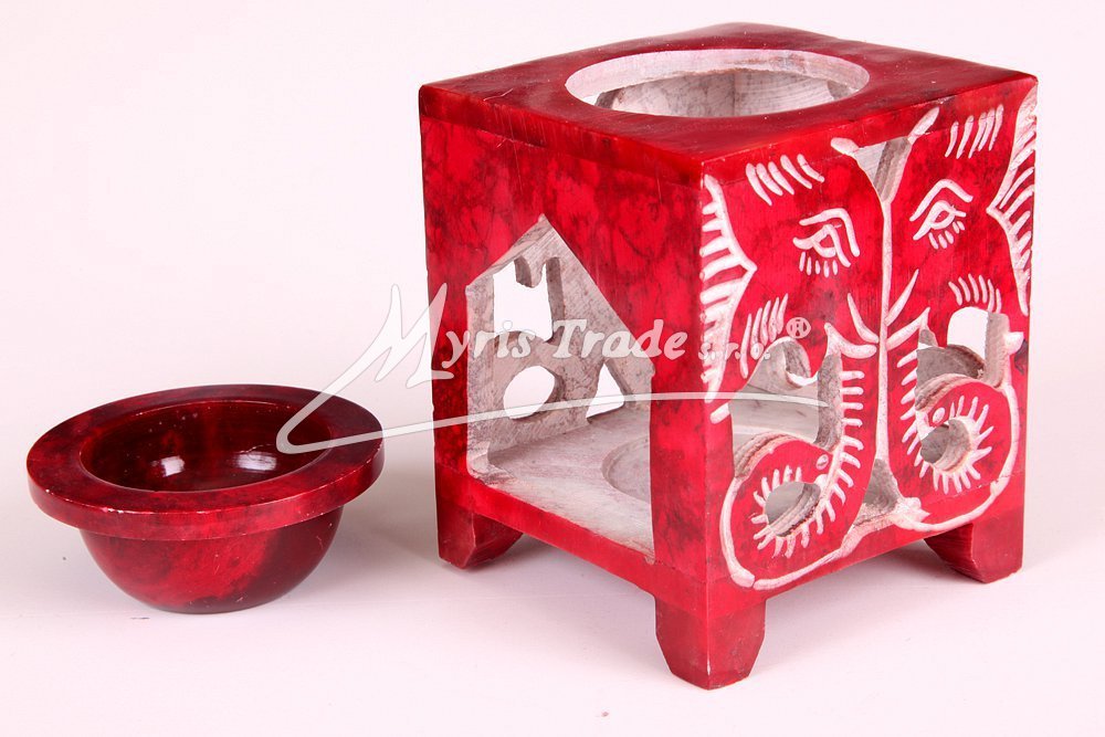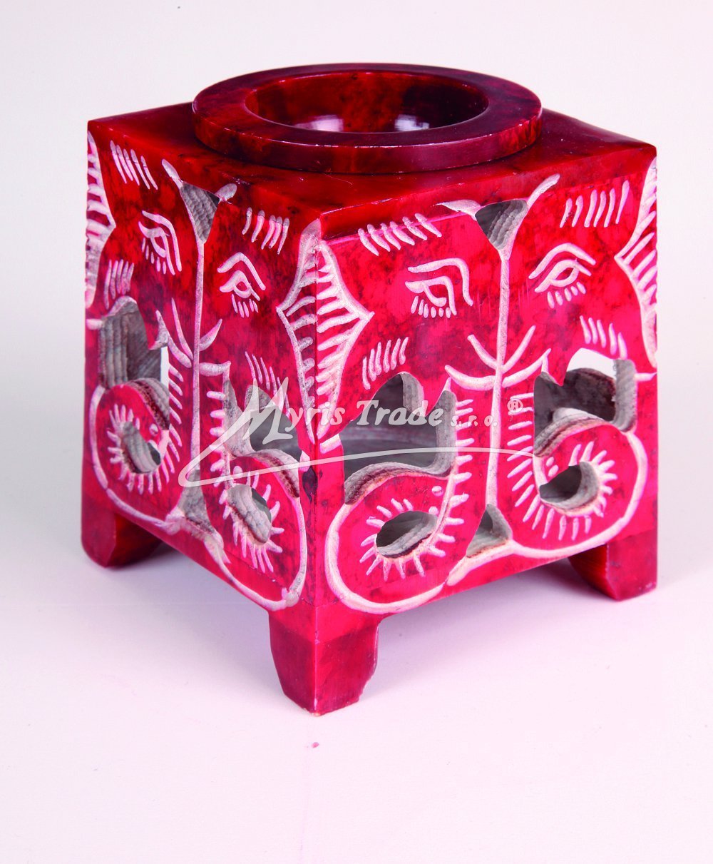 ručně vyřezávaná červená čtvercová aromalampa na čajovou svíčku a aromaolej s motivem slonů