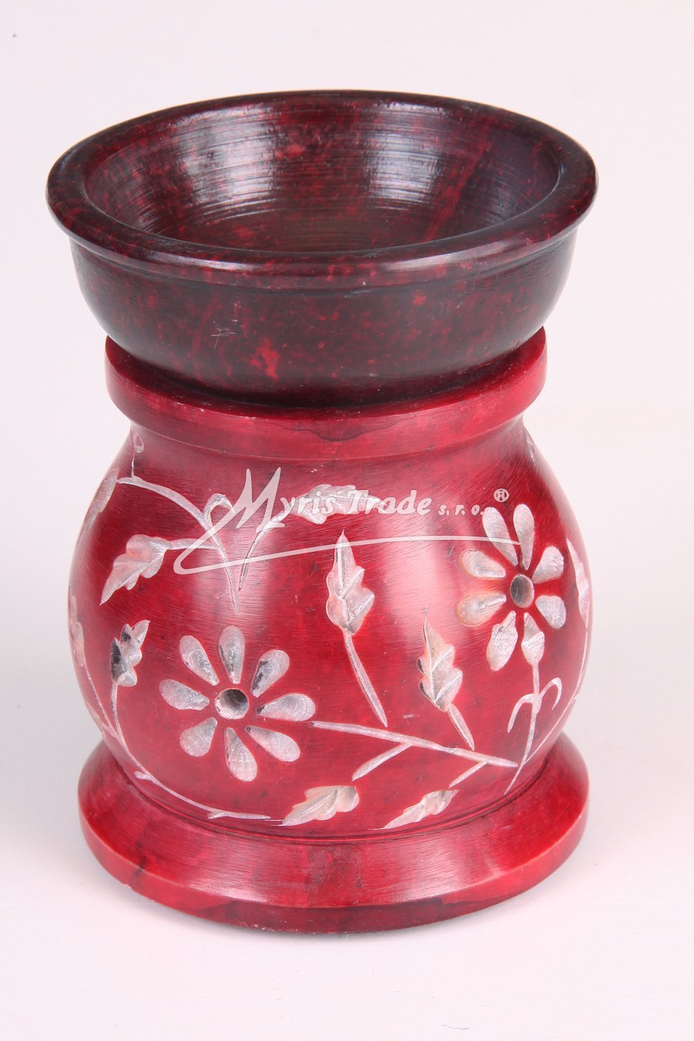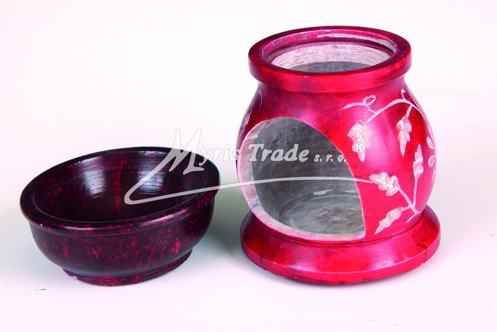 ručně vyřezávaná červená malá aromalampa na čajovou svíčku a aromaolej s motivem květin
