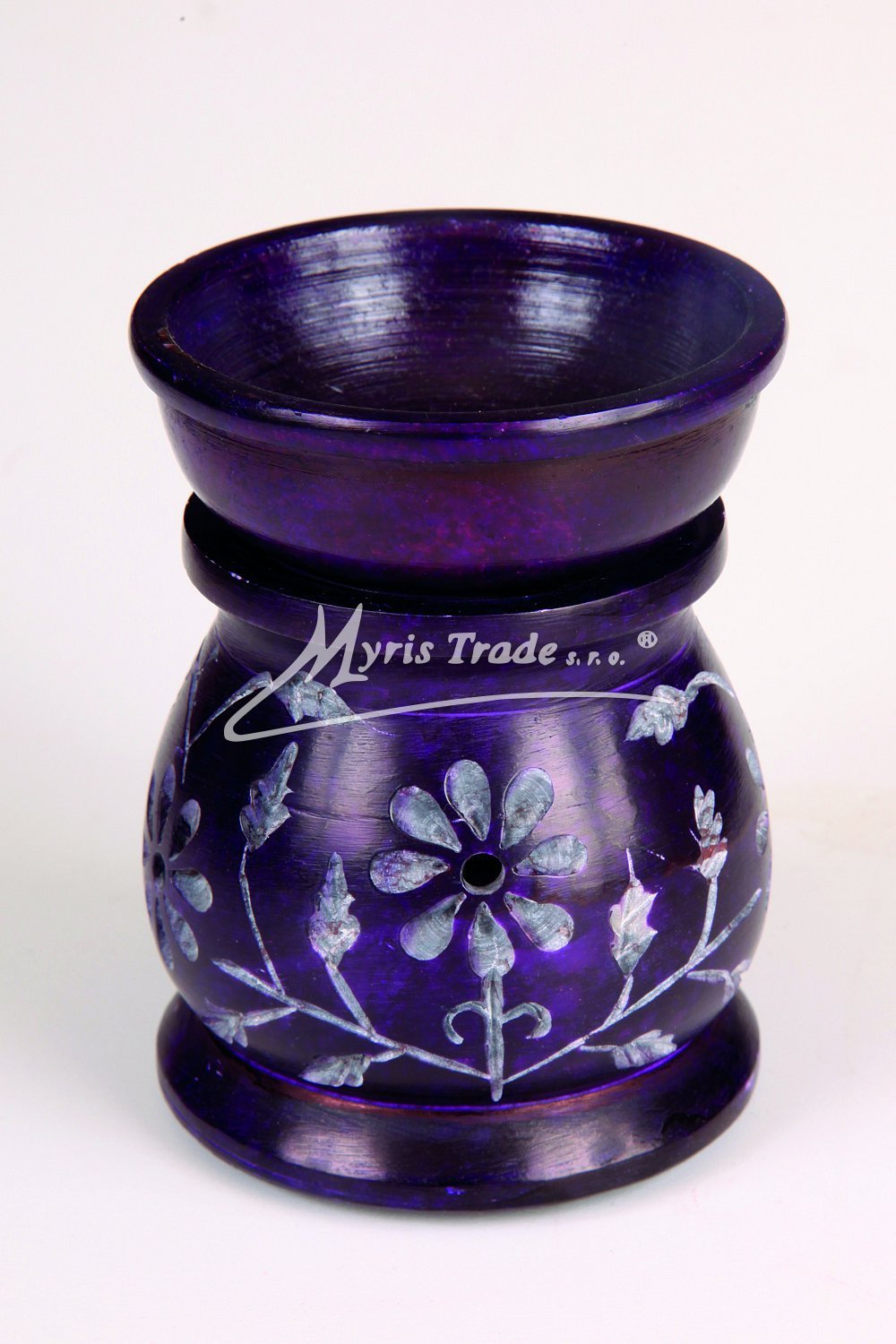 ručně vyřezávaná tmavě fialová malá aromalampa na čajovou svíčku a aromaolej s motivem květin