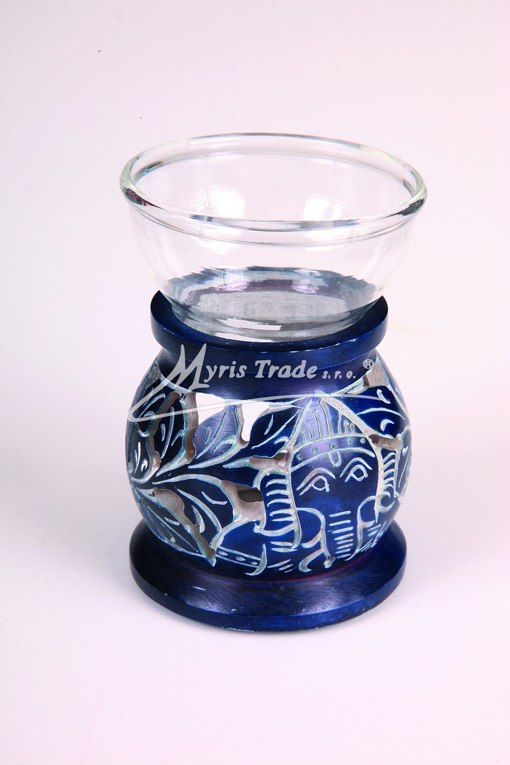 ručně vyřezávaná tmavě modrá malá aromalampa na čajovou svíčku a aromaolej s motivem slona