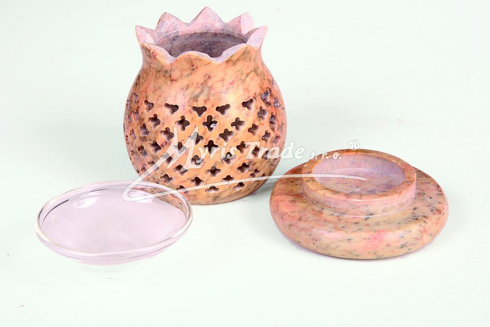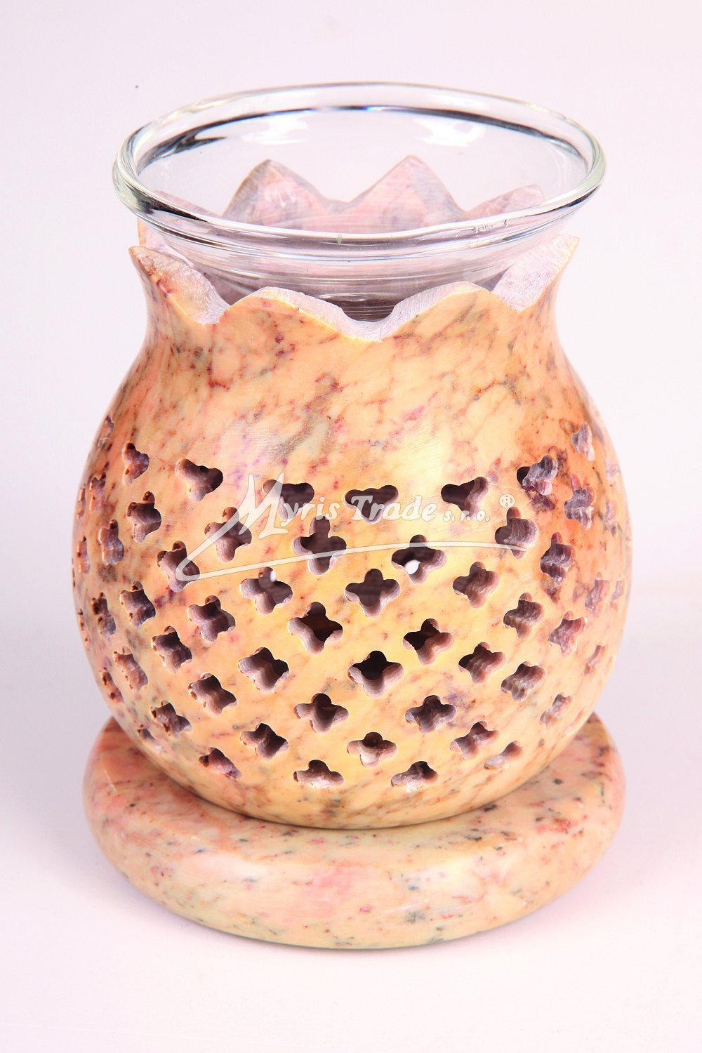 materiál: mastek miska na aromatický olej je skleněná U každého kusu se jedná o originální ruční práci, žádný kus proto není stejný. výška: 11,00 cm průměr: 6,00 cm