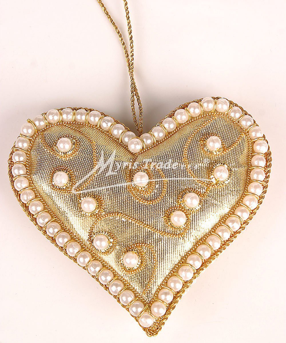 Sametové srdce pošité perličkami. Srdce může sloužit jako vánoční ozdoba nebo i jako dekorace mimo vánoční sezónu. Je vyrobeno ze sametu a je ručně pošívané perličkami a kovovým drátkem ve zlaté barvě.