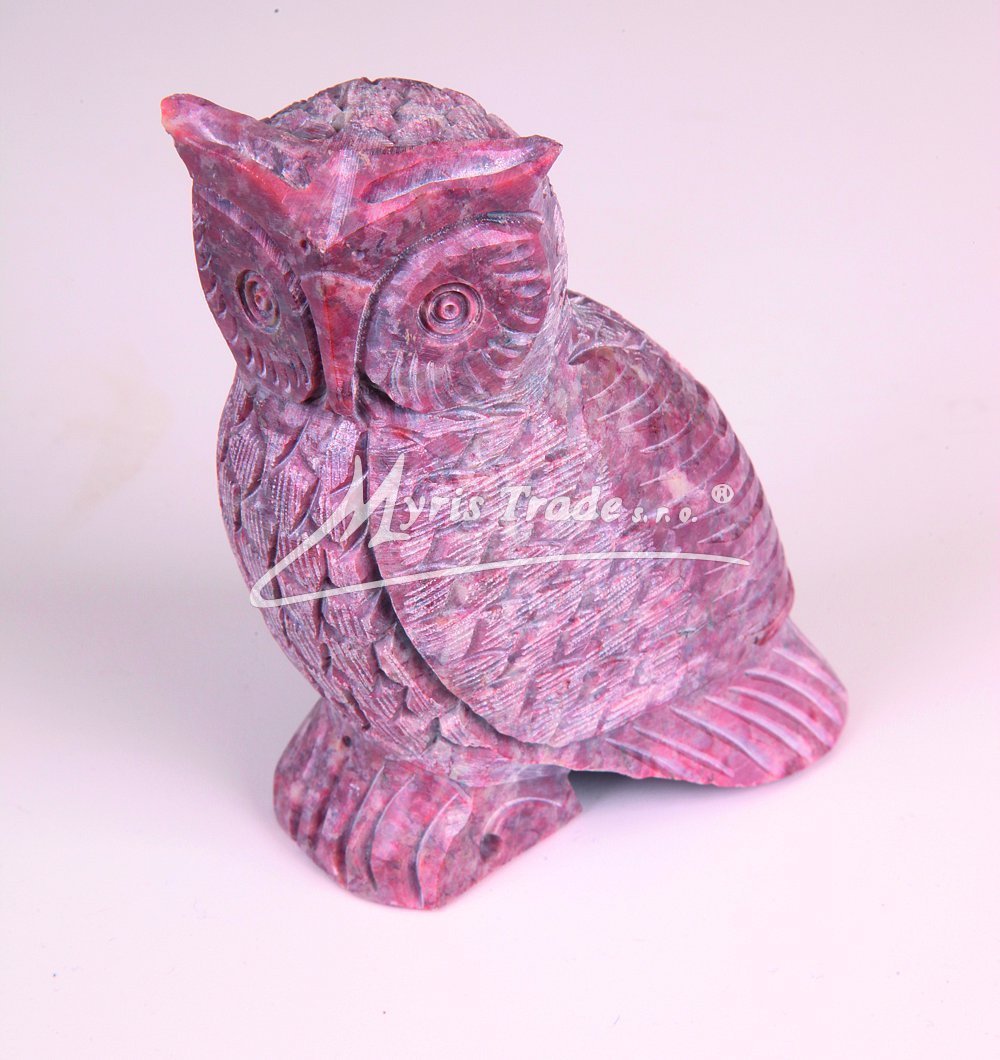 Ručně vyřezávaná a bohatě zdobená figurka sovy z barevného mastku. Každý kus je originál vzhledem k různému zbarvení a žilkování kamene.