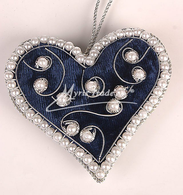 Sametové srdce pošité perličkami. Srdce může sloužit jako vánoční ozdoba nebo i jako dekorace mimo vánoční sezónu. Je vyrobeno ze sametu a je ručně pošívané perličkami a kovovým drátkem ve stříbrné barvě.