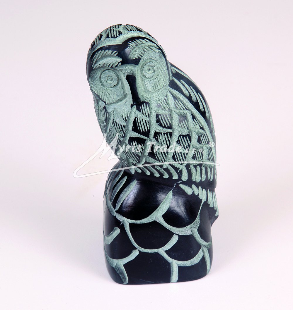 Ručně vyřezávaná a bohatě zdobená figurka sovy z černo-šedého mastku.