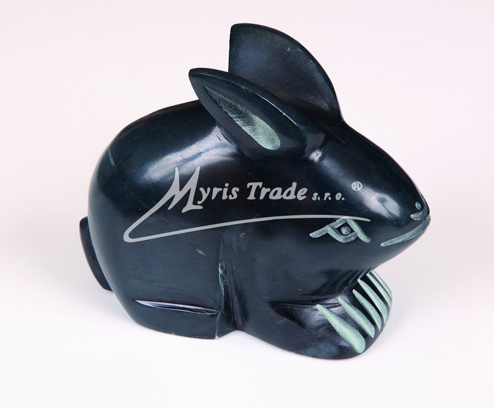 Soška zajíčka z leštěného černého mastku. Lze používat jako těžítko.