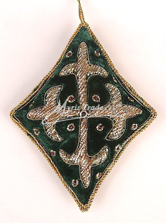Textilní dekorace pošitá korálky. Diamant může sloužit jako vánoční ozdoba, nebo i jako dekorace mimo vánoční sezónu. Je vyroben ze sametu a je ručně pošitý drobnými korálky a kovovým drátkem ve zlaté barvě.