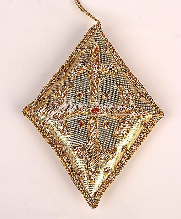 Textilní dekorace pošitá korálky. Diamant může sloužit jako vánoční ozdoba, nebo i jako dekorace mimo vánoční sezónu. Je vyroben ze sametu a je ručně pošitý drobnými korálky a kovovým drátkem ve zlaté barvě.