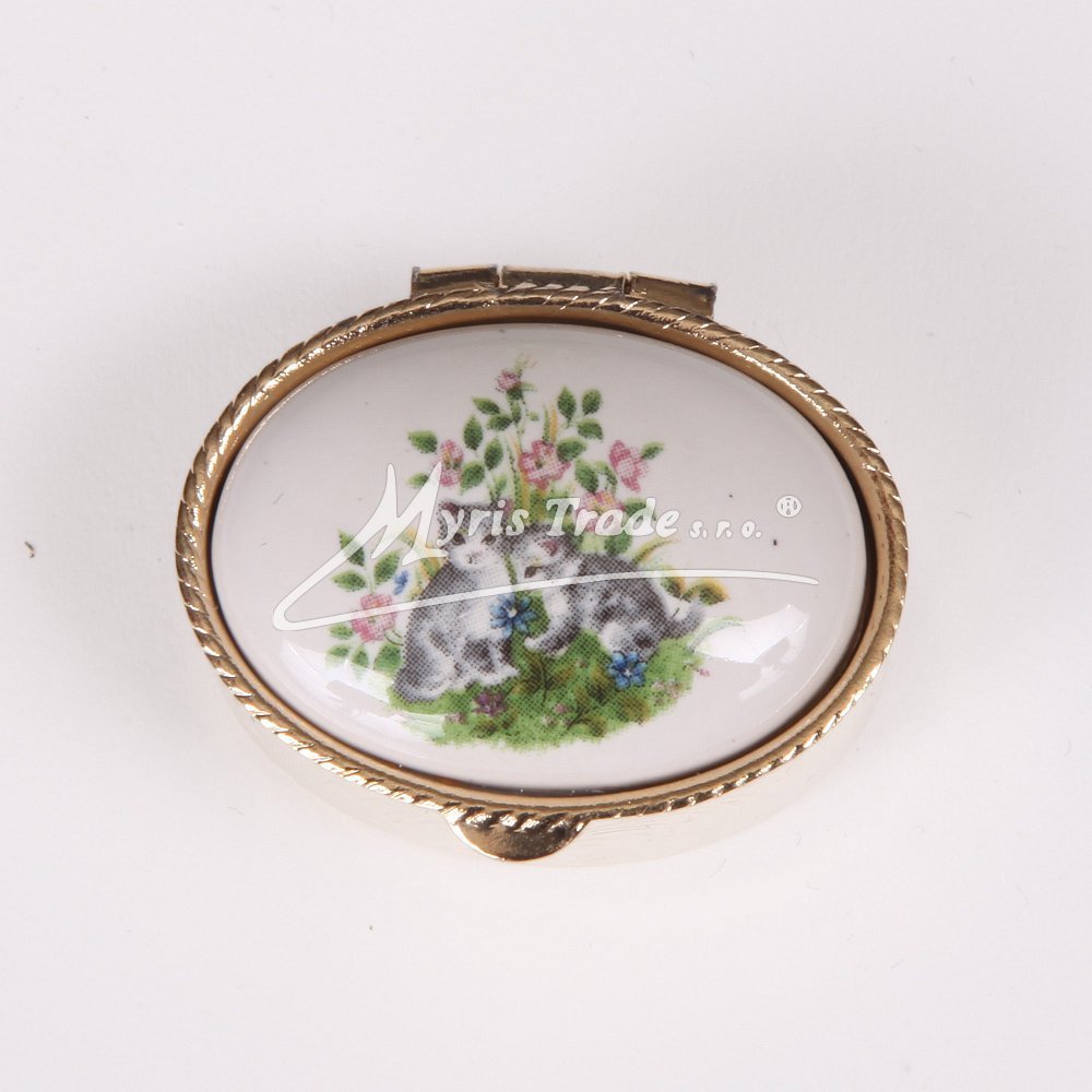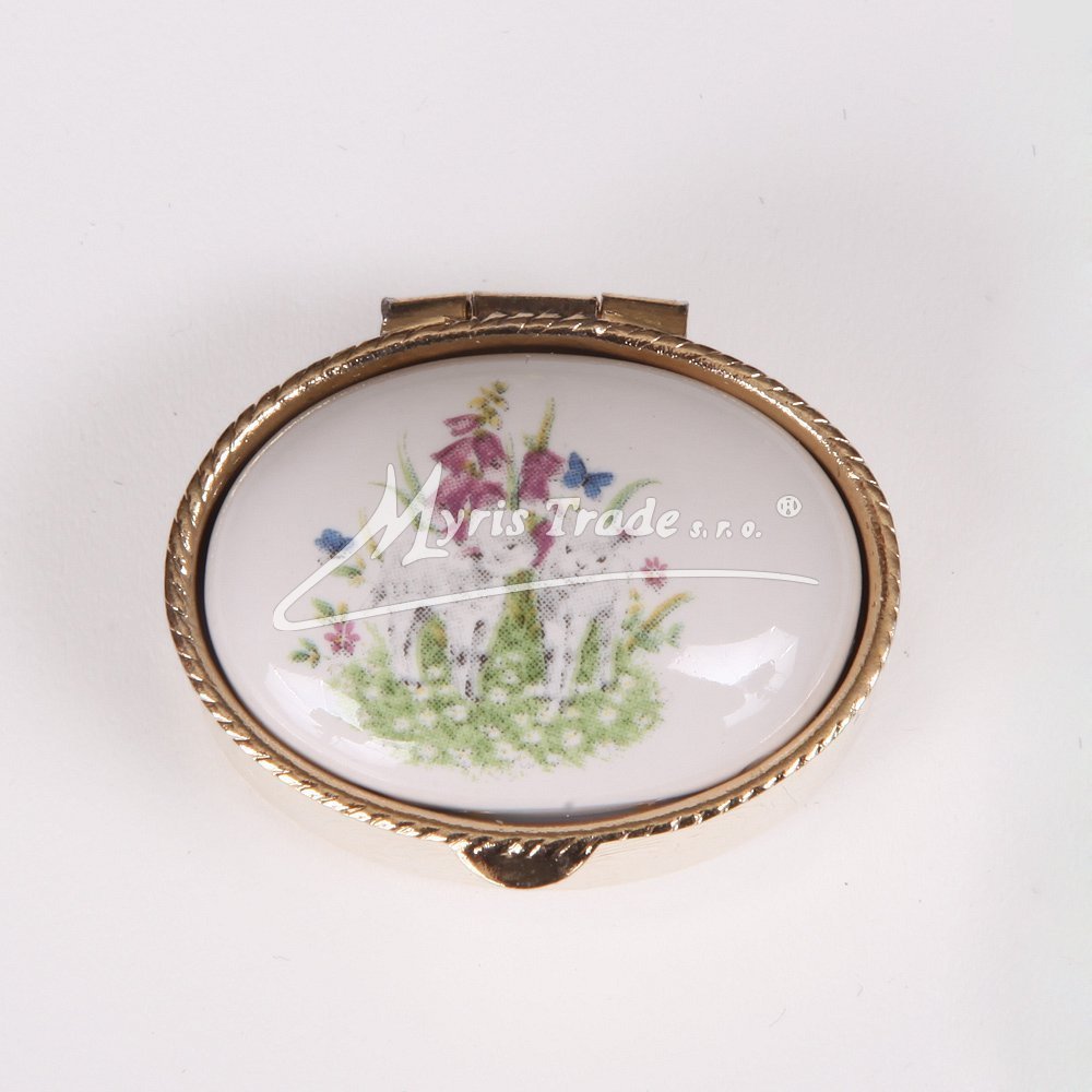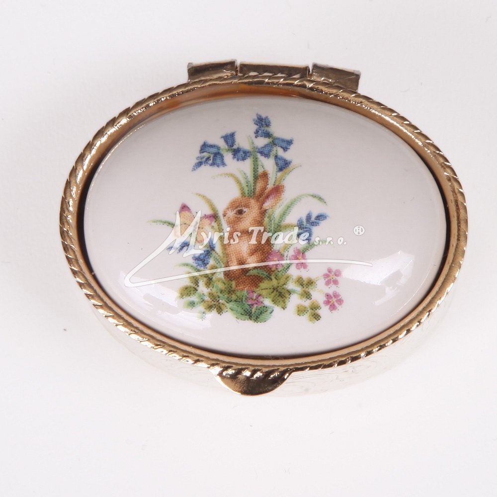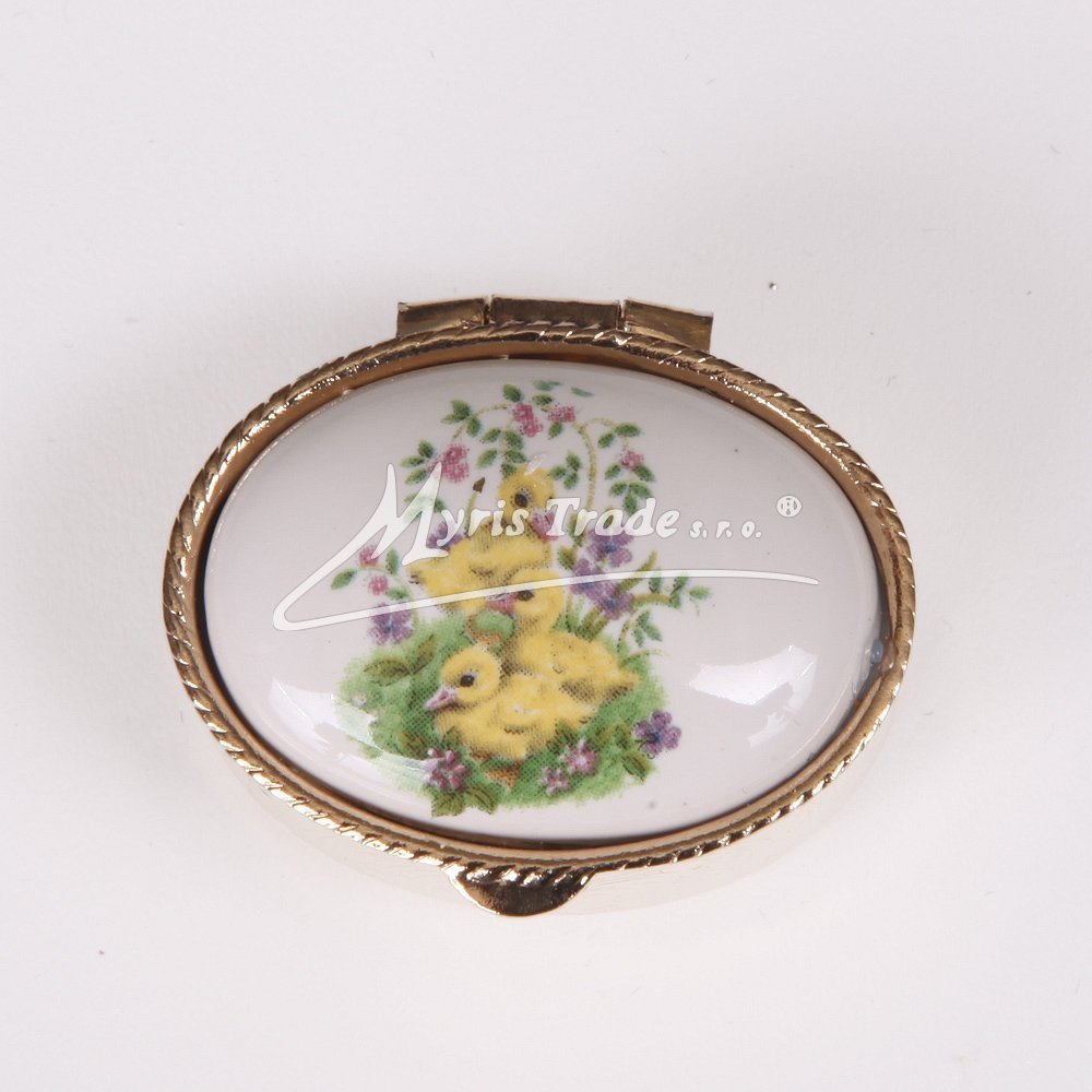 malá oválná lékovka je vyrobena z kovu zlaté barvy s porcelánovým víčkem s jarními - velikonočními motivy