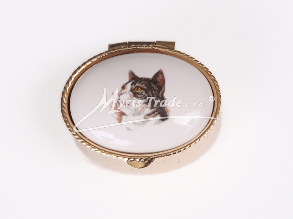 malá oválná lékovka je vyrobena z kovu zlaté barvy s porcelánovým víčkem s motivem hlavy kočky