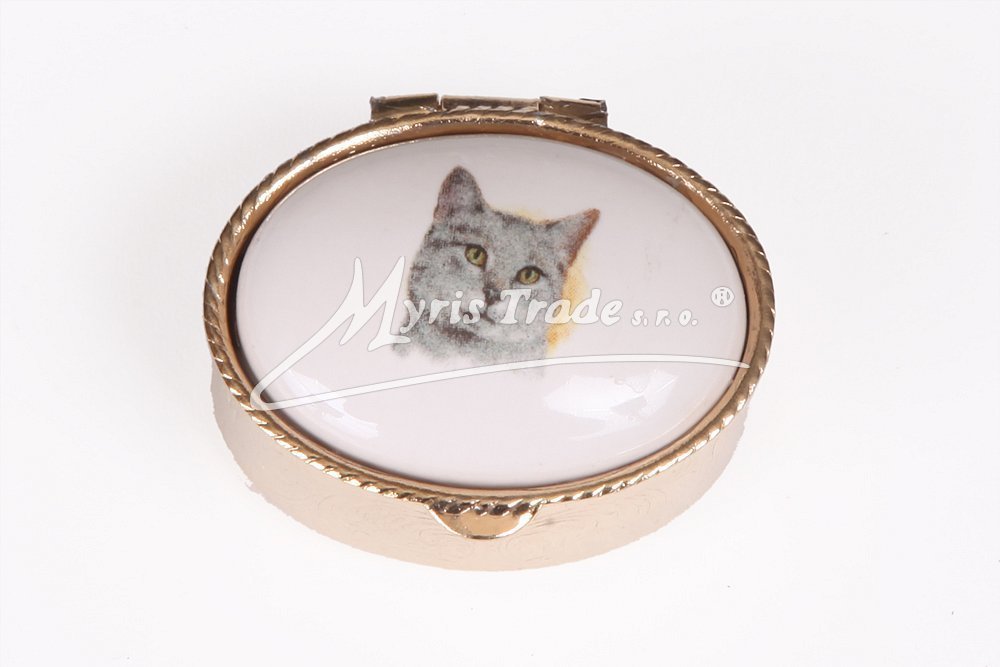 malá oválná lékovka je vyrobena z kovu zlaté barvy s porcelánovým víčkem s motivem hlavy kočky