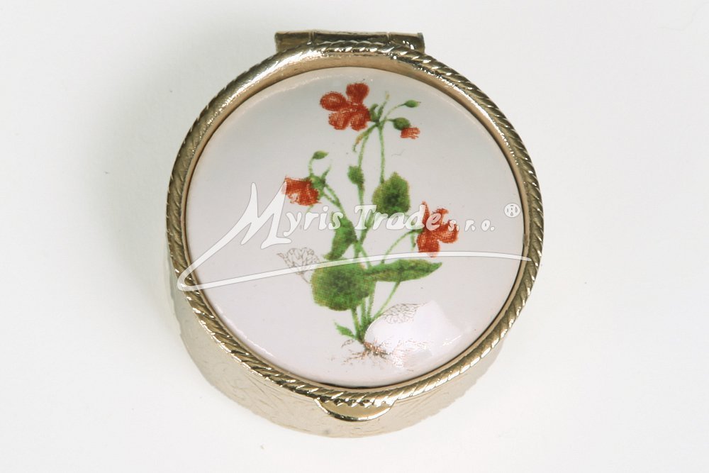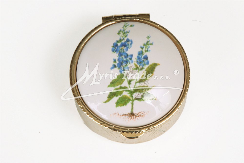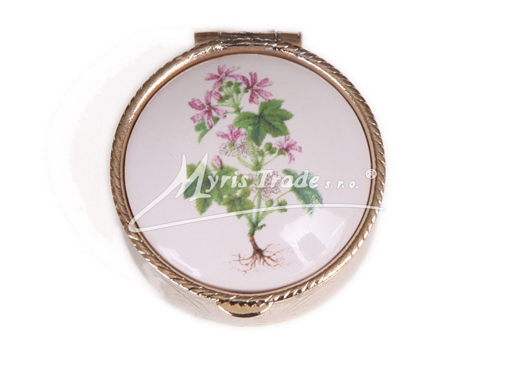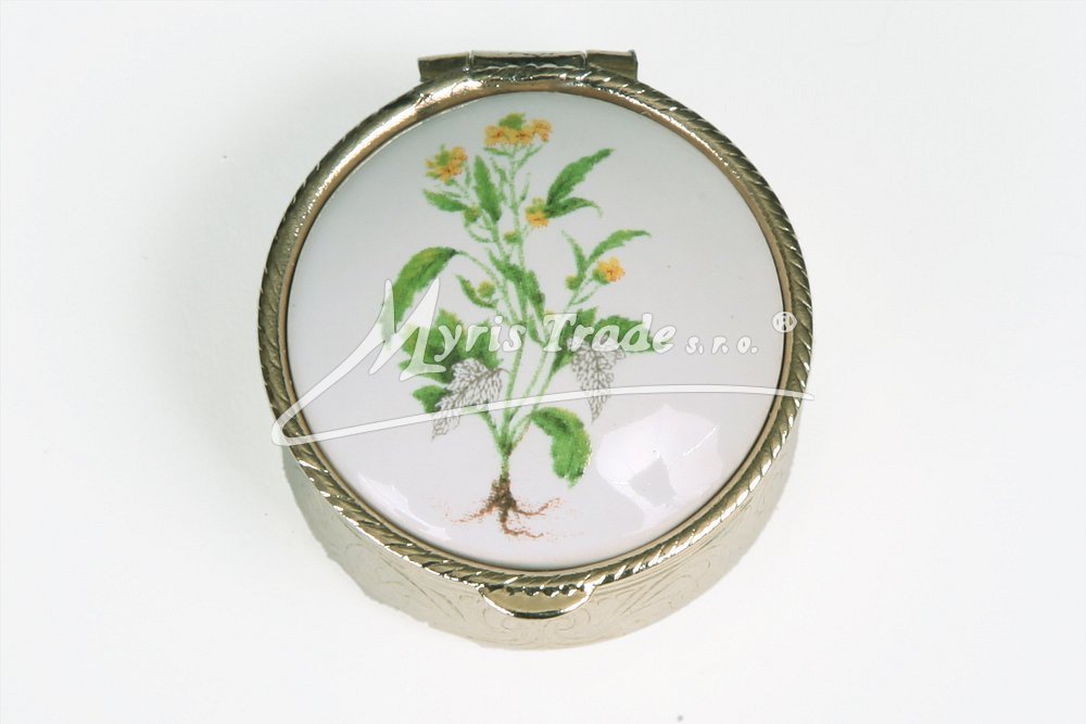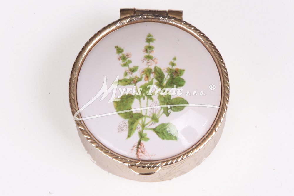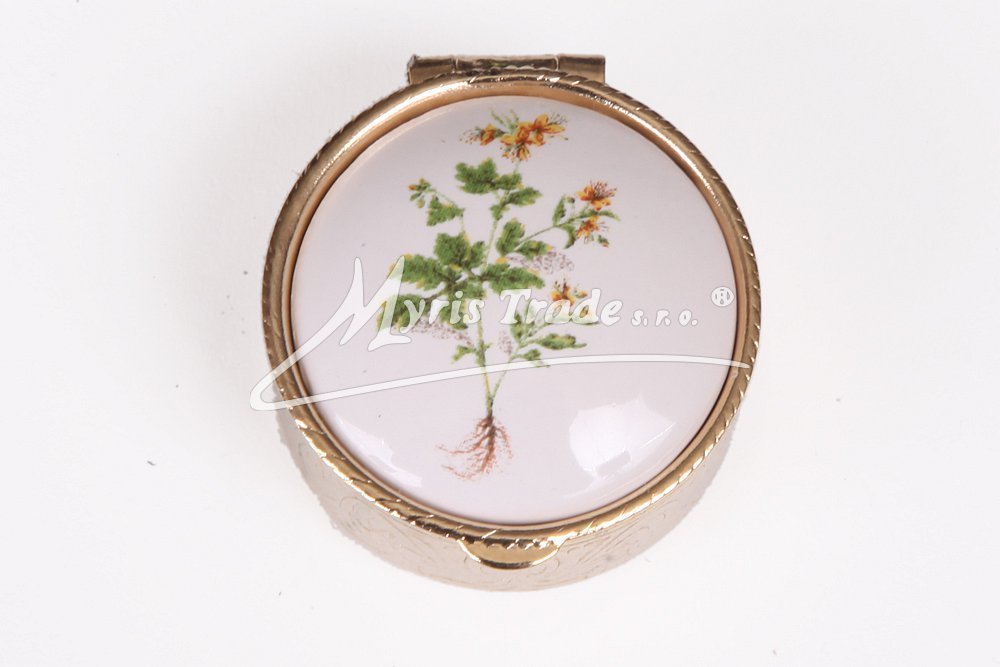 malá kulatá lékovka je vyrobena z kovu zlaté barvy s porcelánovým víčkem s motivem bylinek