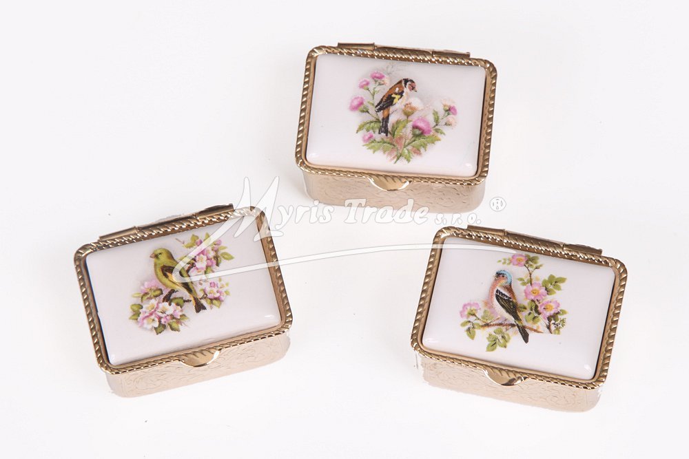 malá obdélníková lékovka je vyrobena z kovu zlaté barvy s porcelánovým víčkem s motivem ptáčků