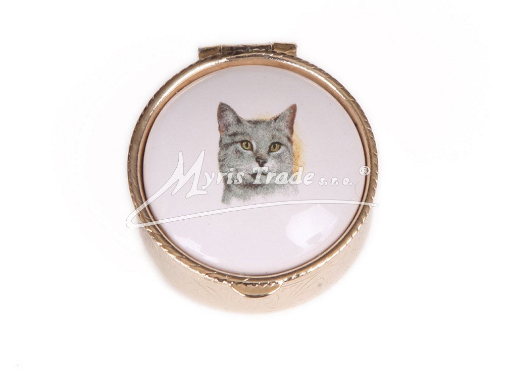 malá kulatá lékovka je vyrobena z kovu zlaté barvy s porcelánovým víčkem s motivem hlavy kočky