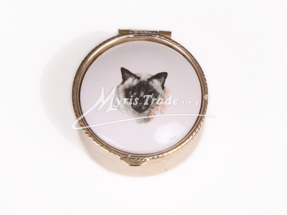 malá kulatá lékovka je vyrobena z kovu zlaté barvy s porcelánovým víčkem s motivem hlavy kočky
