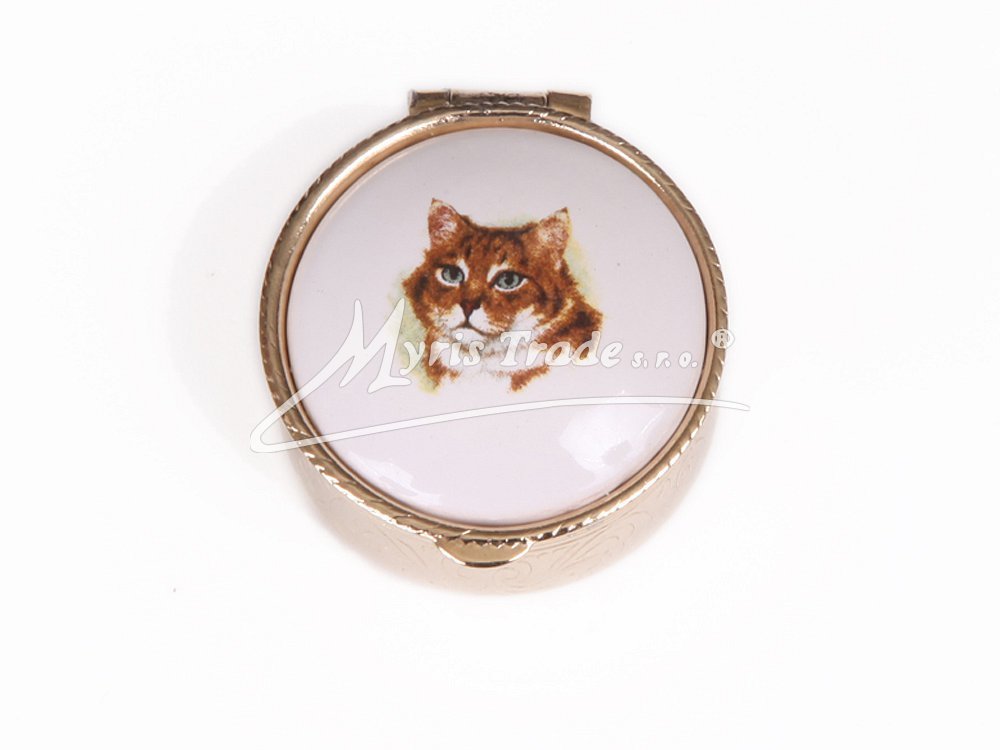 malá kulatá lékovka je vyrobena z kovu zlaté barvy s porcelánovým víčkem s motivem hlavy kočky