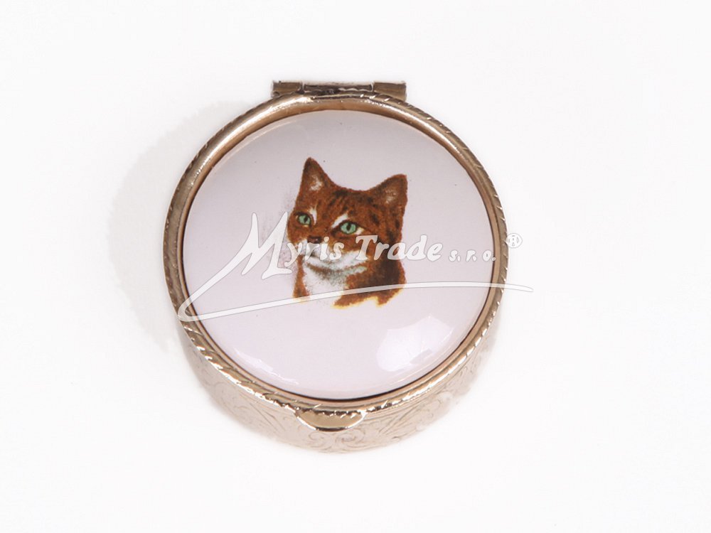 malá kulatá lékovka je vyrobena z kovu zlaté barvy s porcelánovým víčkem s motivem hlavy kočky