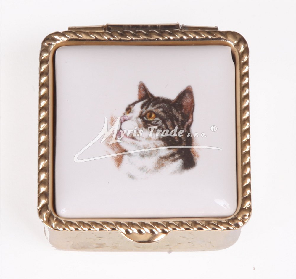 malá čtvercová lékovka je vyrobena z kovu zlaté barvy s porcelánovým víčkem s motivem hlavy kočky