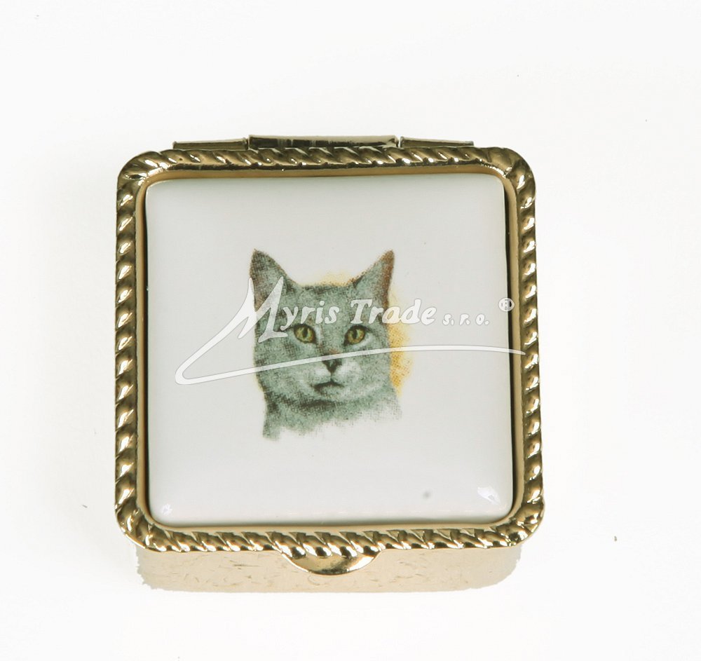 malá čtvercová lékovka je vyrobena z kovu zlaté barvy s porcelánovým víčkem s motivem hlavy kočky