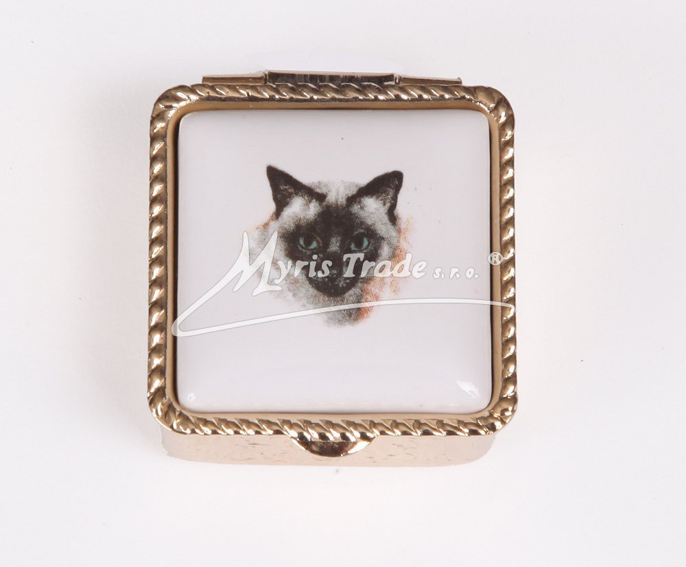 malá čtvercová lékovka je vyrobena z kovu zlaté barvy s porcelánovým víčkem s motivem hlavy kočky