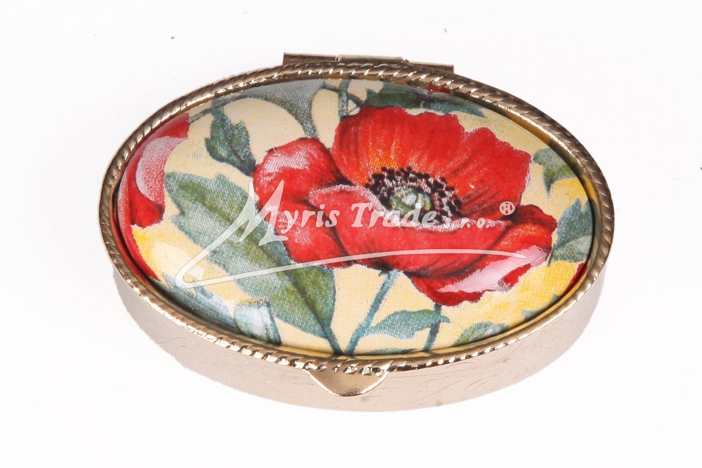 klasická oválná lékovka je vyrobena z kovu zlaté barvy s porcelánovým víčkem s květinovým motivem