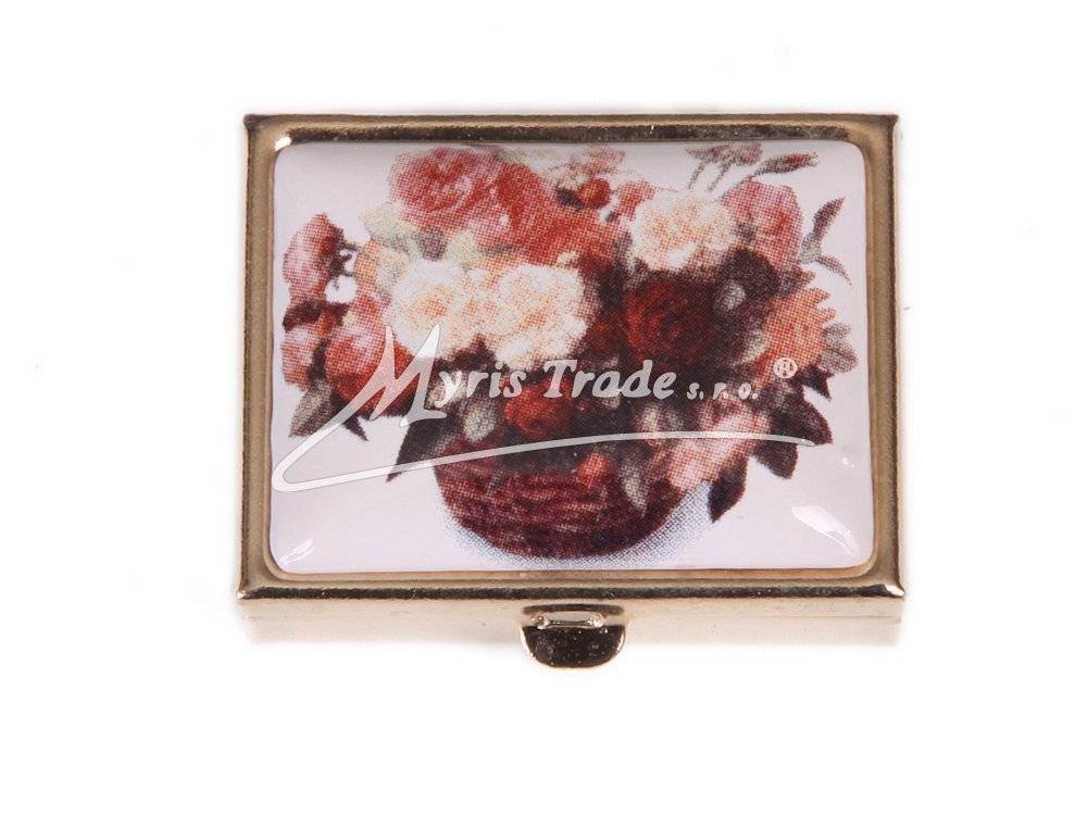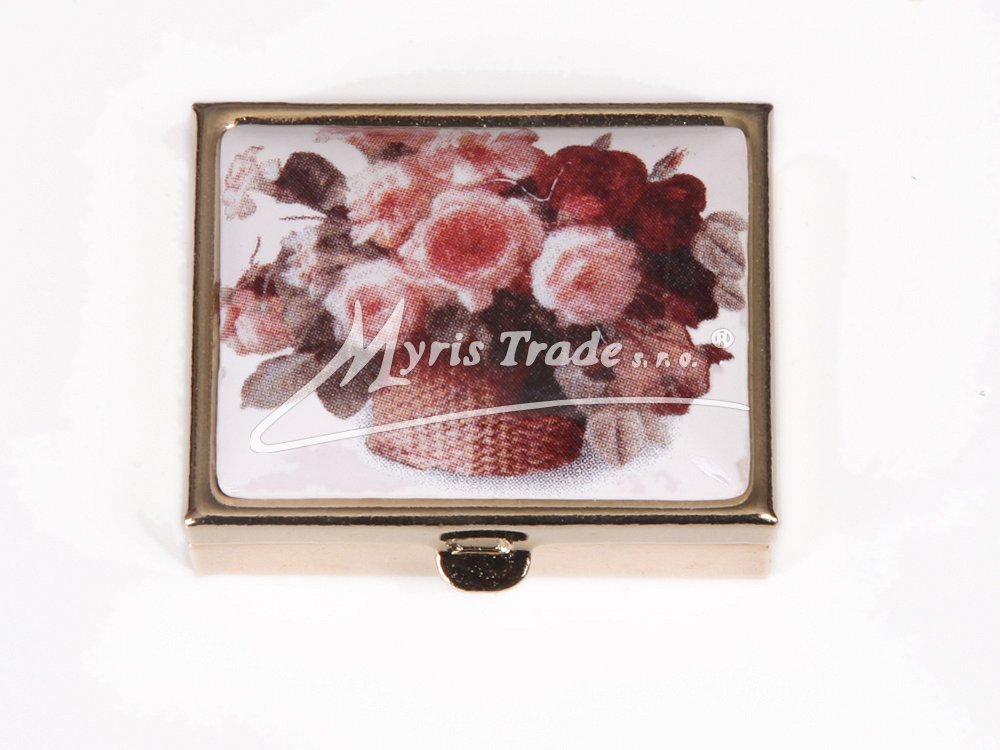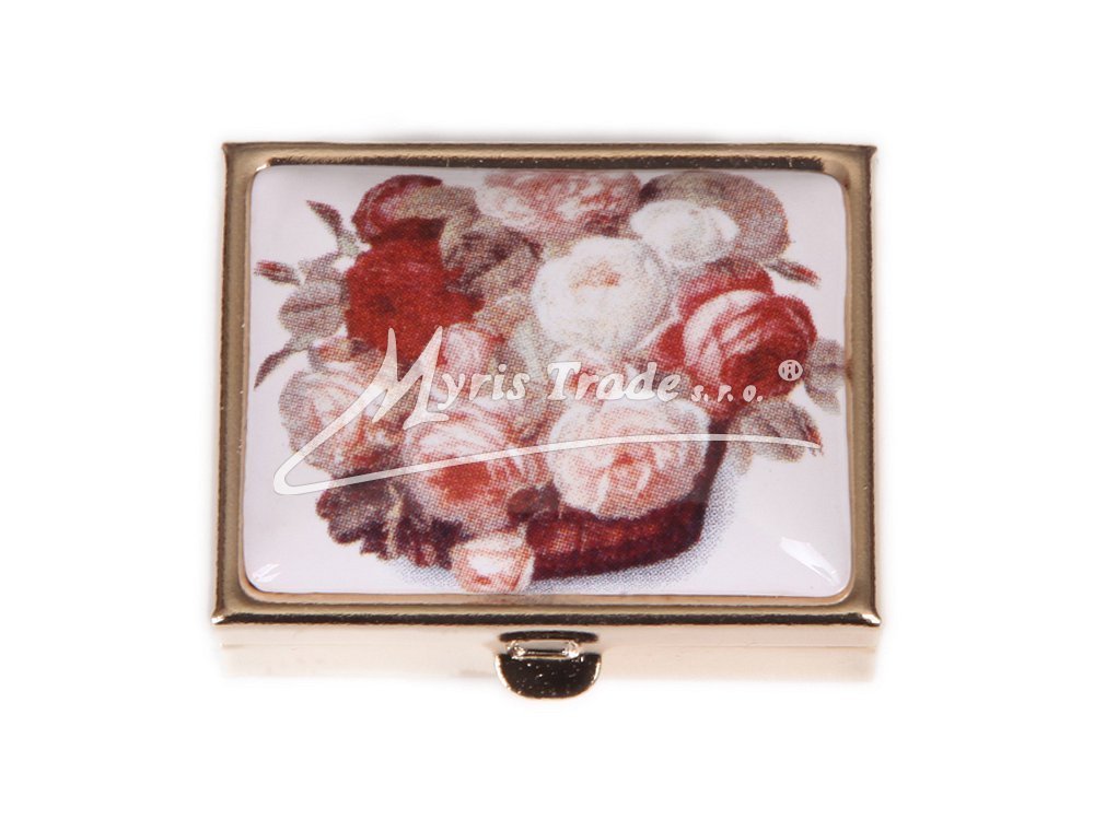 klasická obdélníková lékovka je vyrobena z kovu zlaté barvy s porcelánovým víčkem s květinovým motivem
