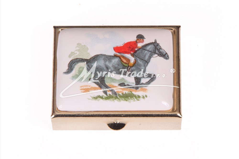 klasická obdélníková lékovka je vyrobena z kovu zlaté barvy s porcelánovým víčkem s motivem koňů