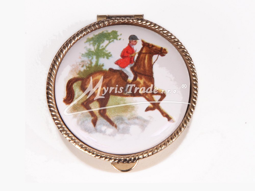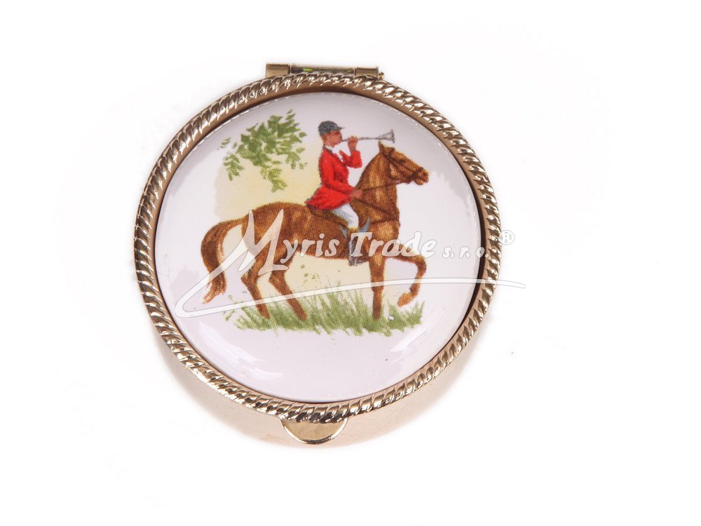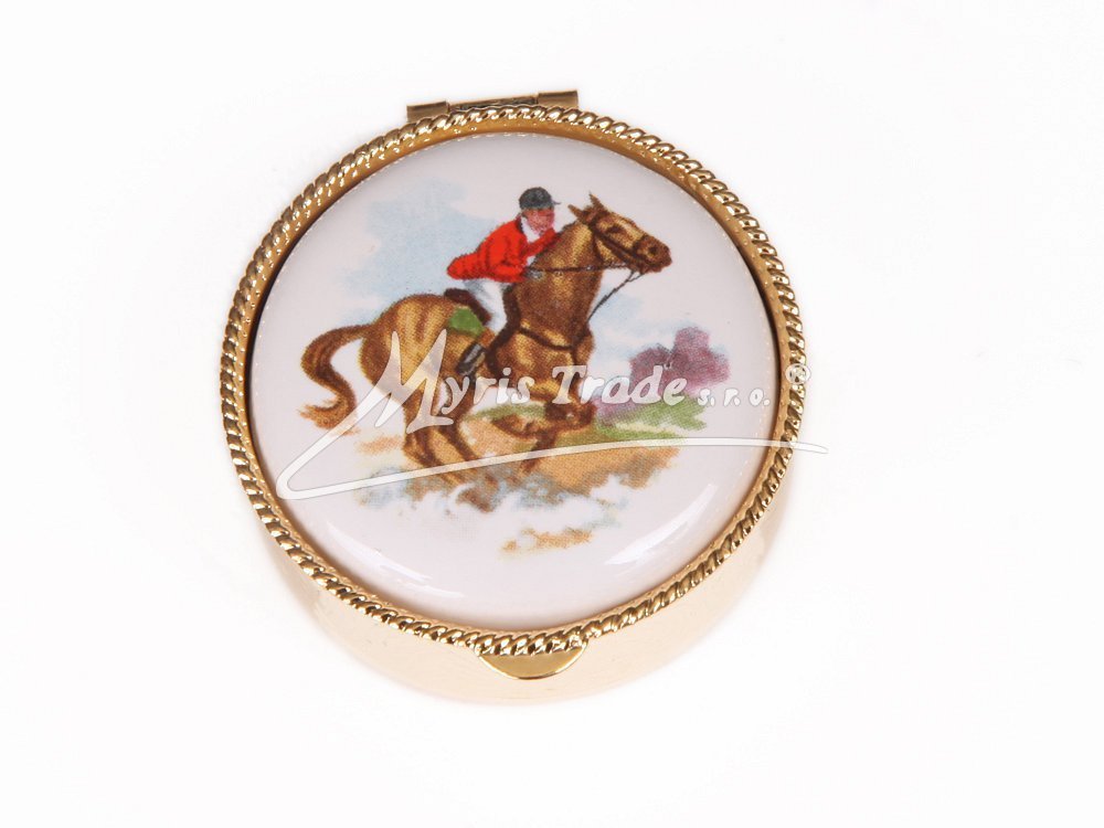 klasická kulatá lékovka je vyrobena z kovu zlaté barvy s porcelánovým víčkem s motivem koňů