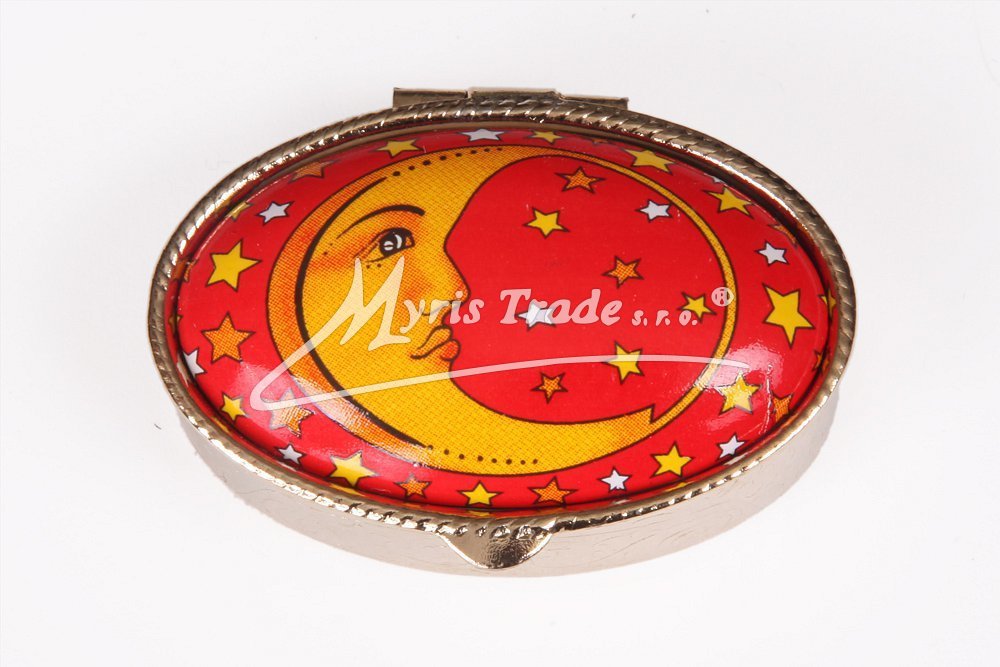 klasická oválná lékovka je vyrobena z kovu zlaté barvy s porcelánovým víčkem s romantickým motivem