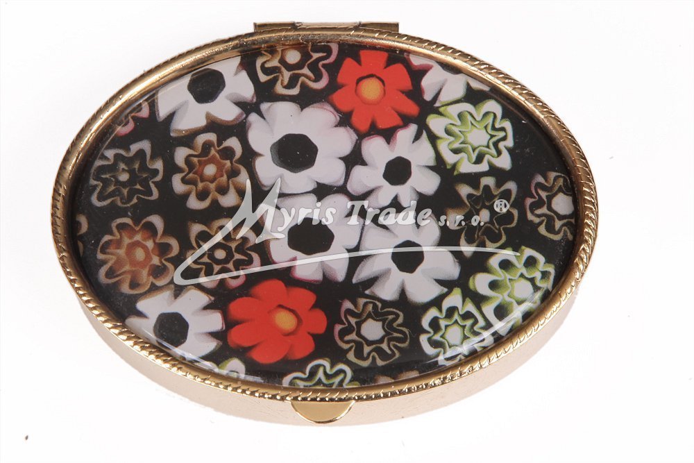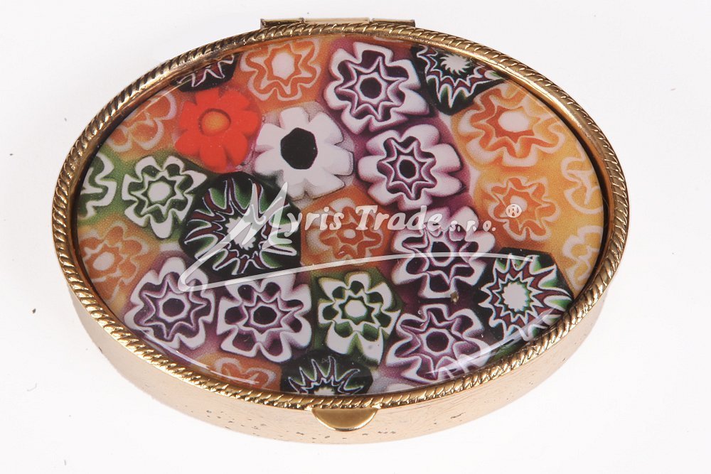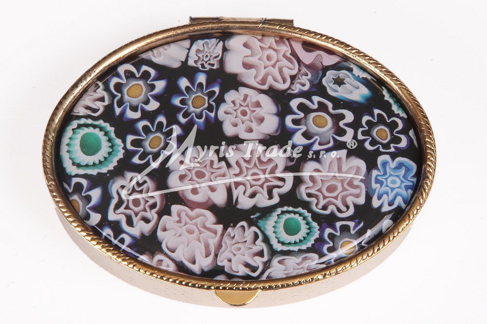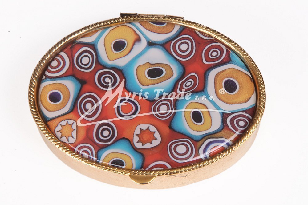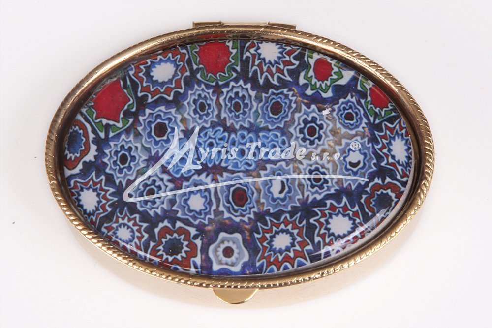 oválná lékovka je vyrobena z kovu zlaté barvy s porcelánovým víčkem se vzory "muránského" skla