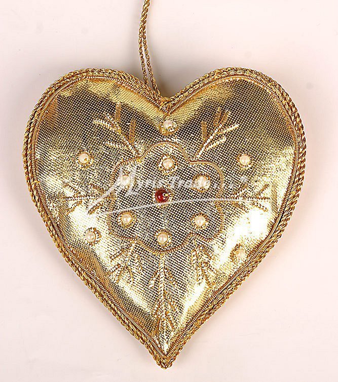 Srdce může sloužit jako vánoční ozdoba nebo i jako dekorace mimo vánoční sezónu. Je vyrobeno ze sametu a je ručně pošívané drobnými perličkami a kovovým drátkem ve zlaté barvě.