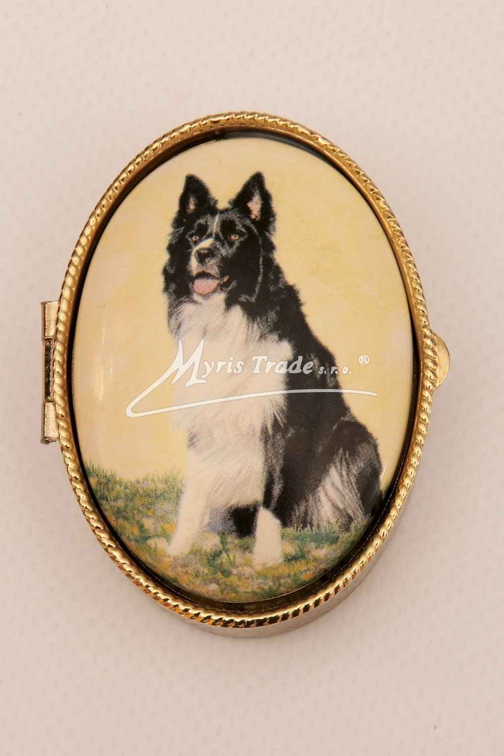 oválná lékovka je vyrobena z kovu zlaté barvy s porcelánovým víčkem s motivem psa