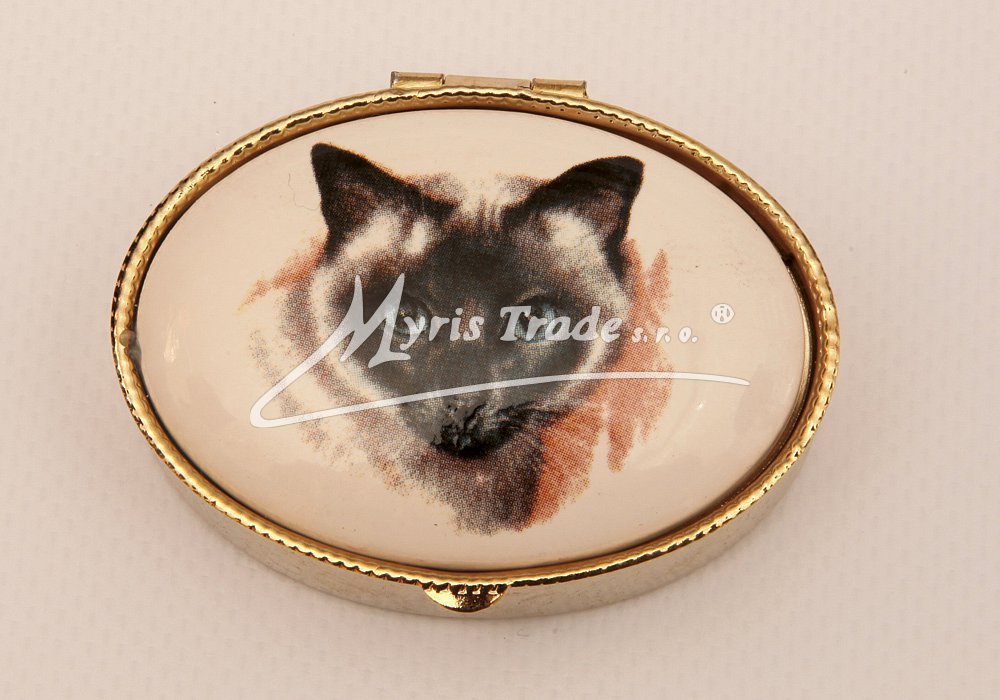 oválná lékovka je vyrobena z kovu zlaté barvy s porcelánovým víčkem s motivem hlavy kočky
