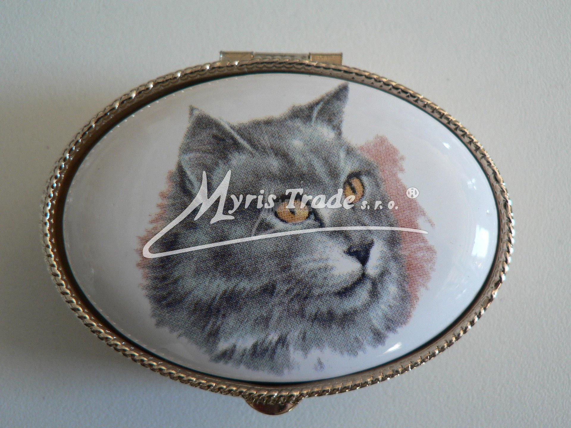 oválná lékovka je vyrobena z kovu zlaté barvy s porcelánovým víčkem s motivem hlavy kočky