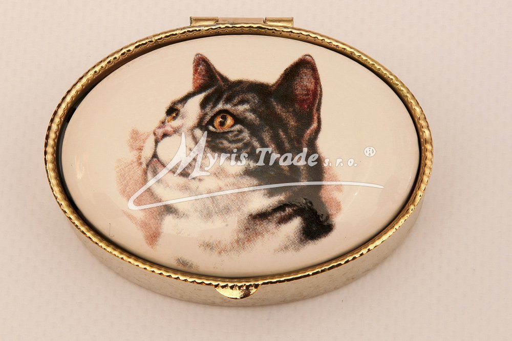 oválná lékovka je vyrobena z kovu zlaté barvy s porcelánovým víčkem s motivem hlavy kočky