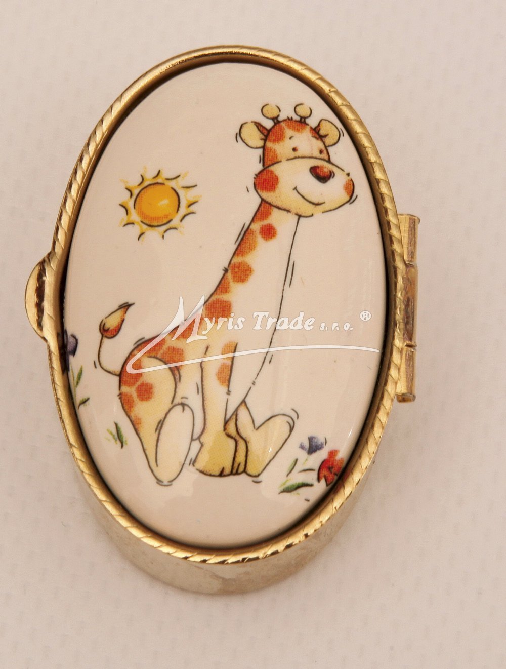klasická oválná lékovka je vyrobena z kovu zlaté barvy s porcelánovým víčkem s motivem kreslených zvířátek