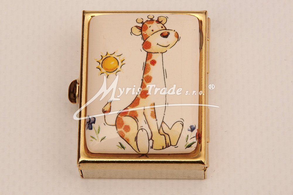 klasická obdélníková lékovka je vyrobena z kovu zlaté barvy s porcelánovým víčkem s motivem kreslených zvířátek