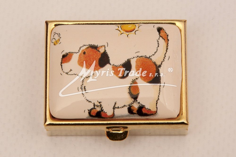 klasická obdélníková lékovka je vyrobena z kovu zlaté barvy s porcelánovým víčkem s motivem kreslených zvířátek