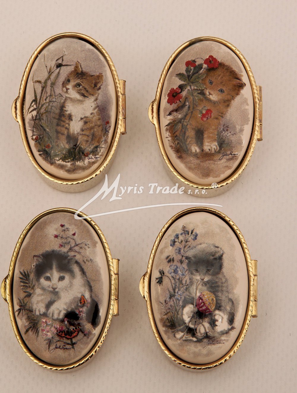 klasická oválná lékovka je vyrobena z kovu zlaté barvy s porcelánovým víčkem s motivem koťátka