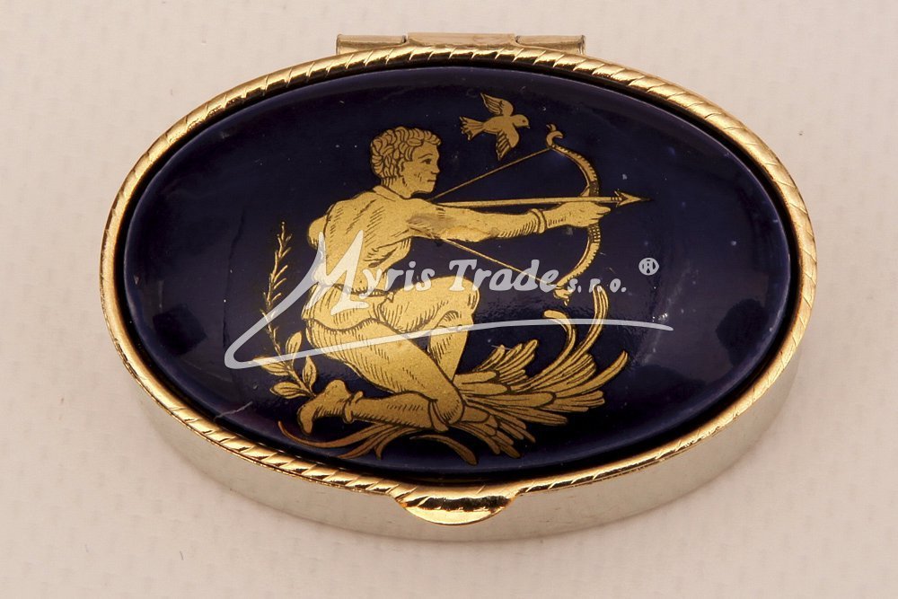 klasická oválná lékovka je vyrobena z kovu zlaté barvy s porcelánovým víčkem s motivem ze zvěrokruhu